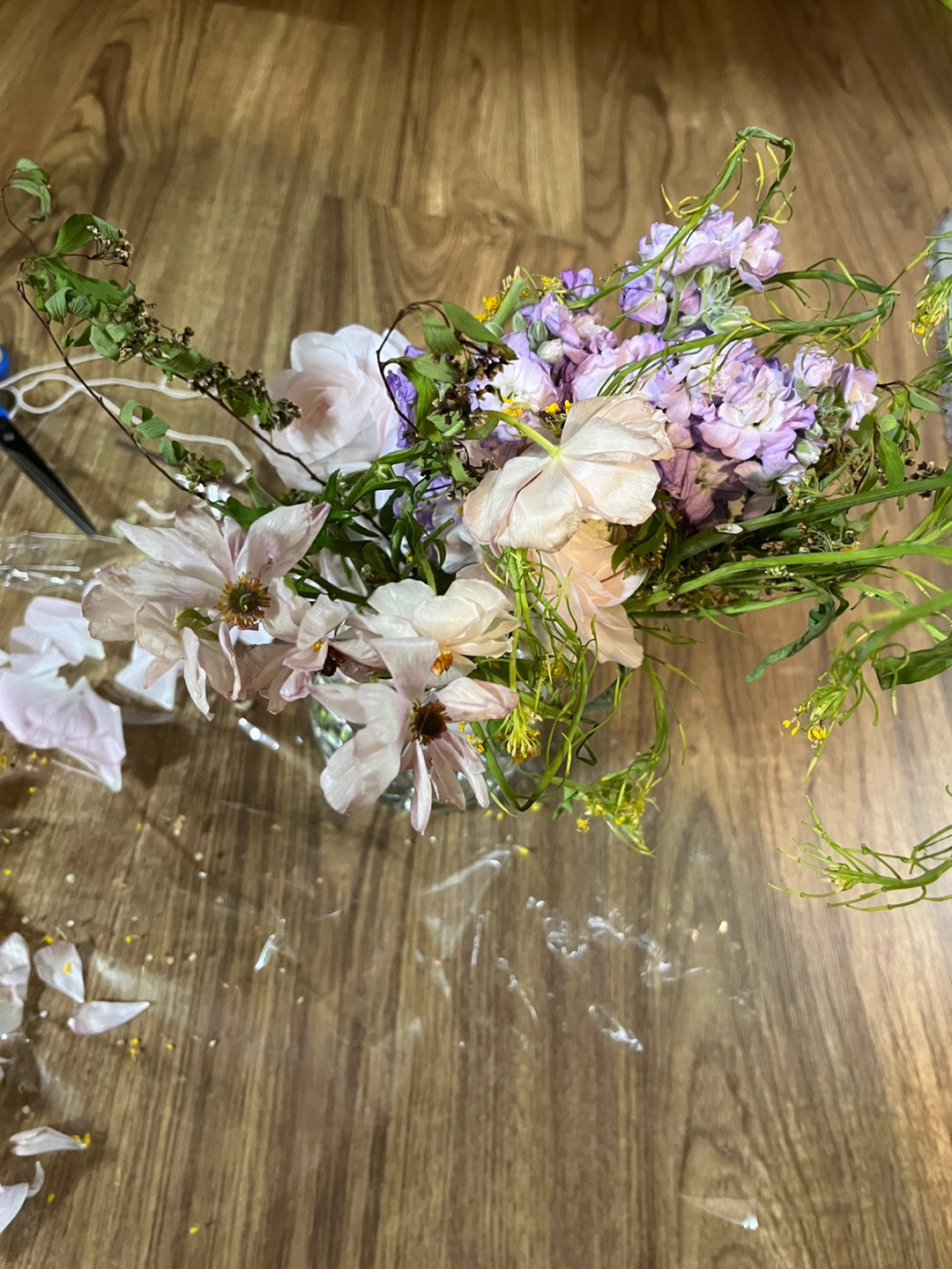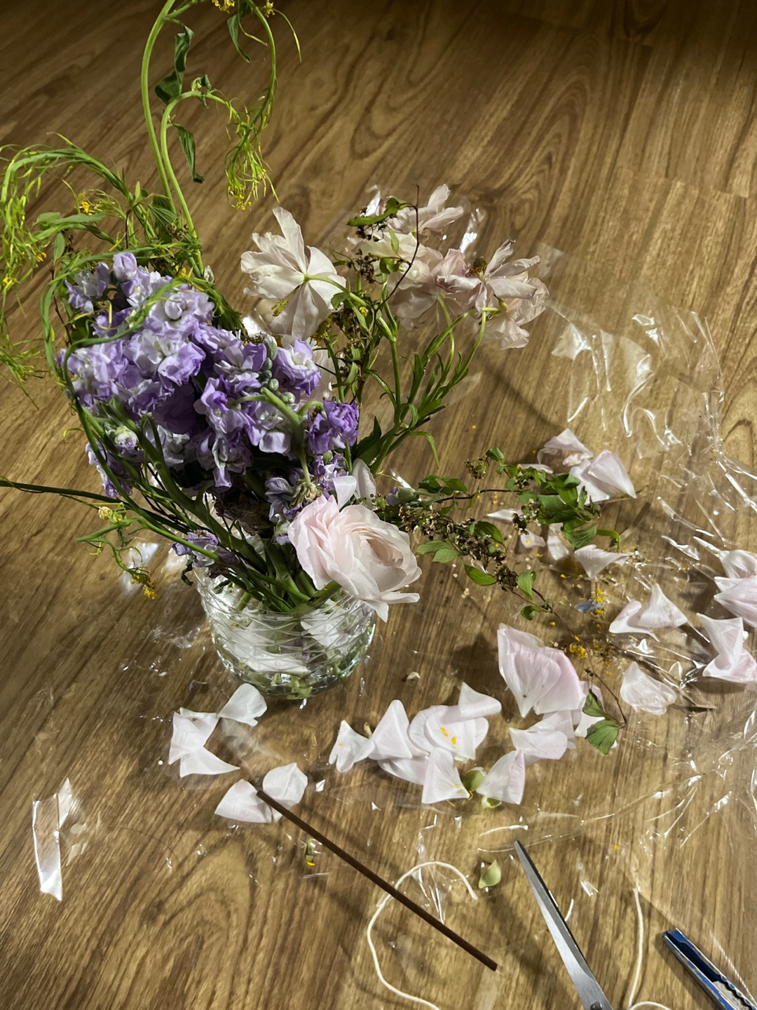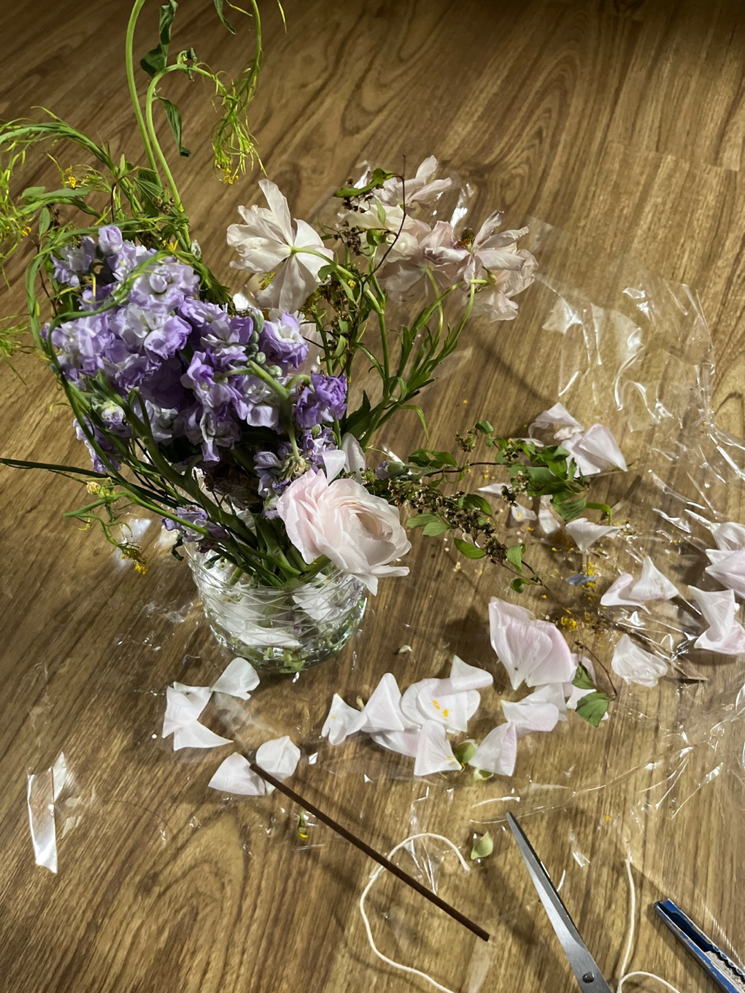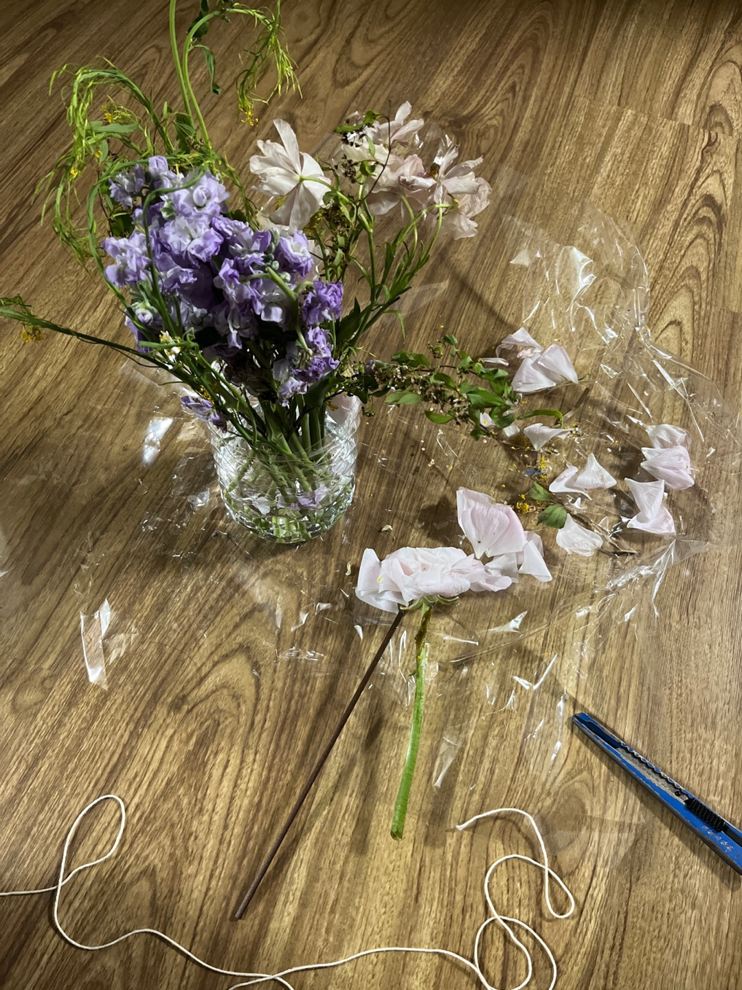 집으로 와서 꽃다발을 풀어 물을 주었다. 부러진 가지 부분은 잘라냈다.